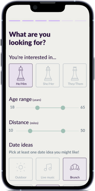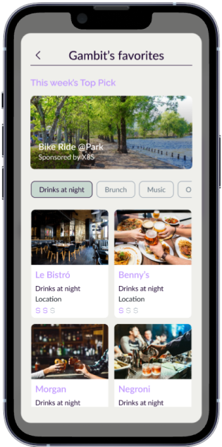 Gambit aimed to provide users with distinctive interaction features and help them plan real-life dates. Users can either create their own plans, use pre-made plans offered by the app that include partnerships with local businesses, or utilize the randomizer for spontaneous adventures.